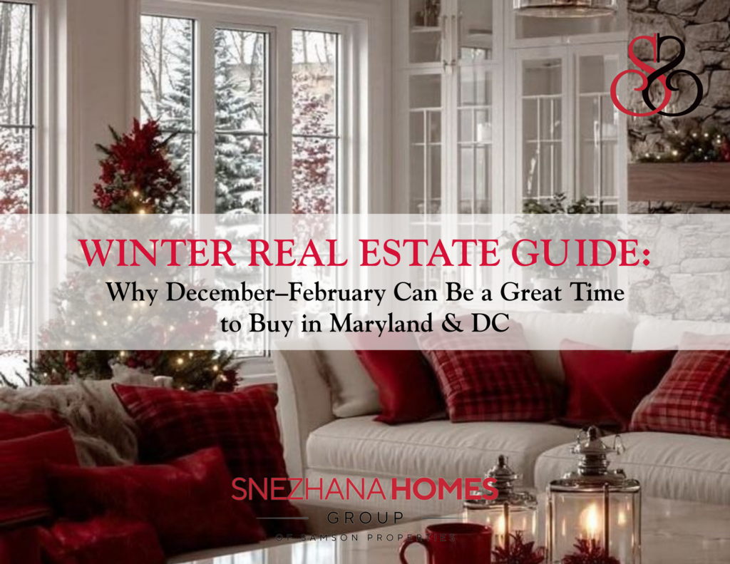 With the cold and snowy weather settled in, many buyers pause their home search and wait for spring. But we’d like to remind you that real estate doesn’t follow a single calendar and that winter can quietly offer some of the best opportunities to buy a home in Maryland and Washington, DC. As a realtor actively serving Montgomery County, Maryland, and Washington DC, Snezhana Conway of Snezhana Homes Group at Samson Properties can assure you that while the market may seem slow on the surface, December through February often rewards buyers who are paying attention.